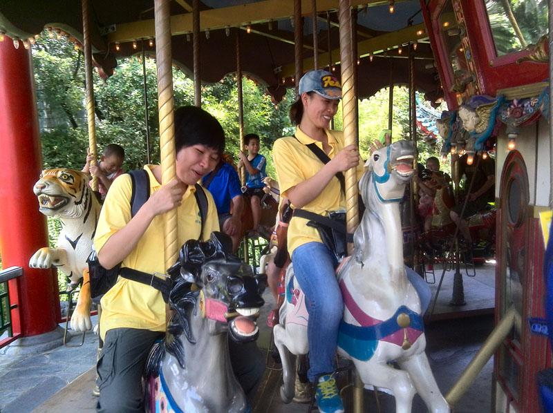 在不遠處有一處漂亮的琉璃瓦大亭子,“呀”!是旋轉(zhuǎn)木馬!大伙嗖的一下全沒影了,原來都跑去坐木馬了,遠遠看去,就像一群“沒長大的孩子”!