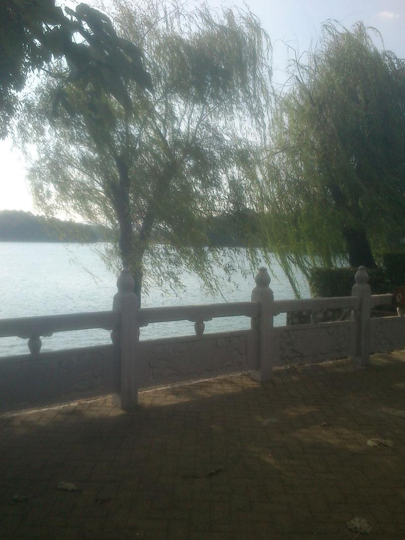 我們一行人迫不及待的拿著手中的門票踏入園內(nèi),迎接我們的是一排整齊的楊柳,它們守護在潔白的欄桿旁,以湖為鏡,欣賞著各自“萬條垂下綠絲絳”之媚態(tài)。此翻看來,楊柳迎客不遜青松哦。