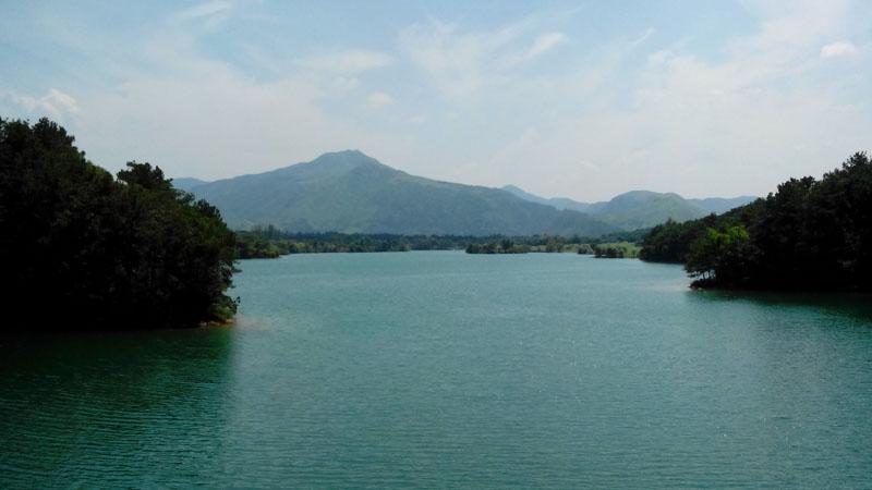 瘋了一個上午,也該好好休息一下了,感受一下這里的美景,滿山翠色,山水相依相伴,還真有“山光悅鳥性,潭影空人心”的味道。游船的船柱上有那么一副對聯(lián):心樂永樂樂滿地;景美人美美靈湖。靈湖?好美的名字!
