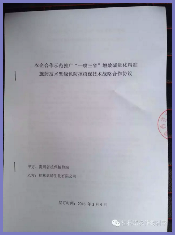 為落實(shí)習(xí)近平總書記、李克強(qiáng)總理關(guān)于食品安全、綠色發(fā)展,保護(hù)資源修復(fù)生態(tài)的指示和農(nóng)業(yè)部印發(fā)的《到2020年農(nóng)藥使用零增長(zhǎng)行動(dòng)方案》,3月9日,貴州省植??傉九c桂林集琦簽訂了共同推廣“一噴三省”增效減量化精準(zhǔn)施藥技術(shù)暨綠色植保集成模式協(xié)議。