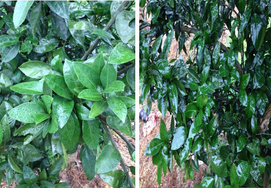 柑橘上未使用與使用一噴三省高效助劑對(duì)比圖片