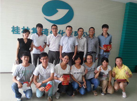 2014年8月15日下午,廣西大學(xué)化學(xué)化工學(xué)院在桂林集琦生化有限公司召開實(shí)習(xí)生工作總結(jié)匯報(bào)會(huì),桂林集琦生化有限公司副總經(jīng)理秦志剛、人力資源部黃小群,化院副院長(zhǎng)郭昌明、龍?jiān)骑w教授、楊華教授等參加會(huì)議。