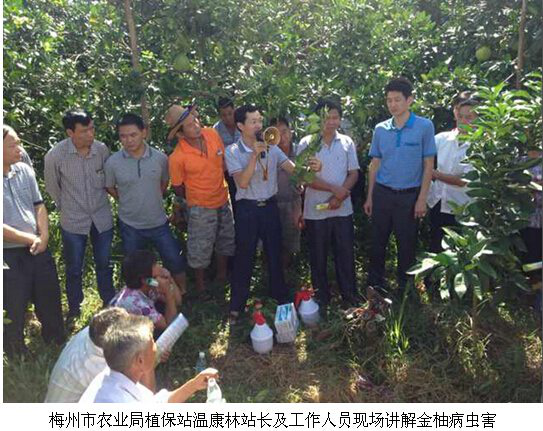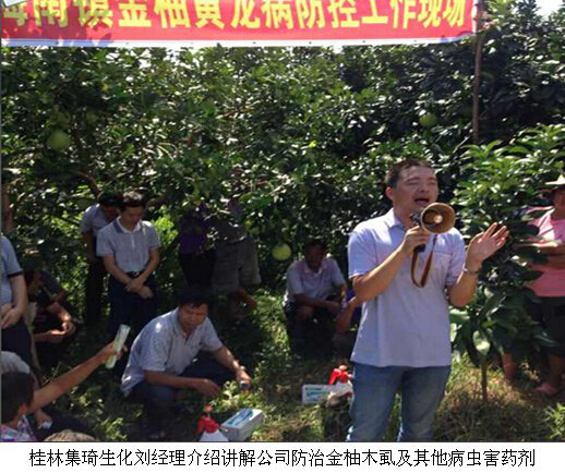 2014年8月25日,桂林集琦生化有限公司廣東片區(qū)劉文靜業(yè)務經(jīng)理參加了廣東梅州市農(nóng)業(yè)局組織的“梅南鎮(zhèn)金柚黃龍病防控現(xiàn)場會”。此次防控現(xiàn)場會到會種植大戶70多人,會議現(xiàn)場,農(nóng)業(yè)局植保站溫康林站長以預防金柚木虱為重點的黃龍病綜合防治技術、金柚主要病蟲害防治要點、金柚水肥及栽培管理技術三個方面為廣大種植戶進行詳細的講解;劉經(jīng)理在會議上介紹了集琦生化公司防治金柚木虱及其他病蟲害藥劑。在現(xiàn)場會上農(nóng)戶聽課認真,提問積極。通過此次大會,一是加強農(nóng)戶對金柚黃龍病的認識,做到提前預防金柚黃龍病避免損失的發(fā)生;二是提高了集琦生化有限公司的品牌形象,為公司今后在該地區(qū)的銷售打下良好基礎。