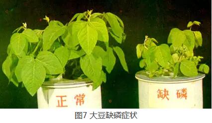 大豆缺磷:葉色變深,呈濃綠或黑綠色,葉形小、尖、窄,且向上直立,植株瘦小,生長緩慢。嚴重時,莖稈可能出現紅色,開花后大豆若缺磷,葉片則出現棕色斑點。