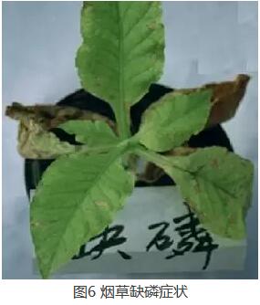煙草缺磷:整株簇生狀,葉窄、色暗,直立,老葉有壞死斑點,干枯后變棕色。經火烤后的煙葉色暗無光澤。