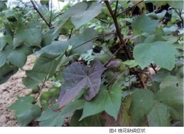 棉花缺磷:植株矮小,蒼老,葉色灰暗、莖細,基部紅色。果枝少、葉片小、葉緣和葉柄常出現紫紅色,根系發(fā)育不良,成熟延遲,蕾鈴易脫落,產量及品質下降。