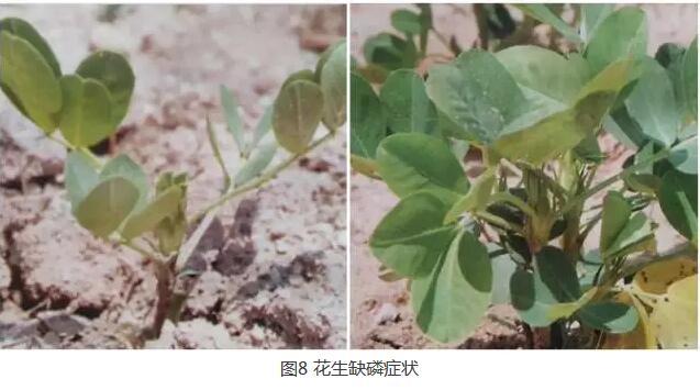 花生缺磷:老葉呈暗綠至藍綠色,以后變黃而脫落,莖基部紅色。