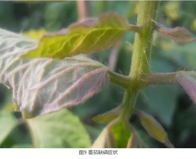 番茄缺磷:在苗較小時下部葉變綠紫色,并逐漸向上部葉擴展。早期葉小并逐漸失去光澤,葉背呈紫紅色,葉片上葉肉組織開始出現褐色斑點,隨后則擴展到整個葉片上,葉片僵硬,葉脈逐漸變?yōu)樽霞t色,葉簇最后也呈紫紅色,下部葉片上卷,葉尖變黑褐色枯死,老葉變黃。莖細長且富含纖維。結果延遲,果實小,受到明顯抑制,成熟晚,產量低。由于缺磷時影響氮素吸收,植株后期呈現卷葉。