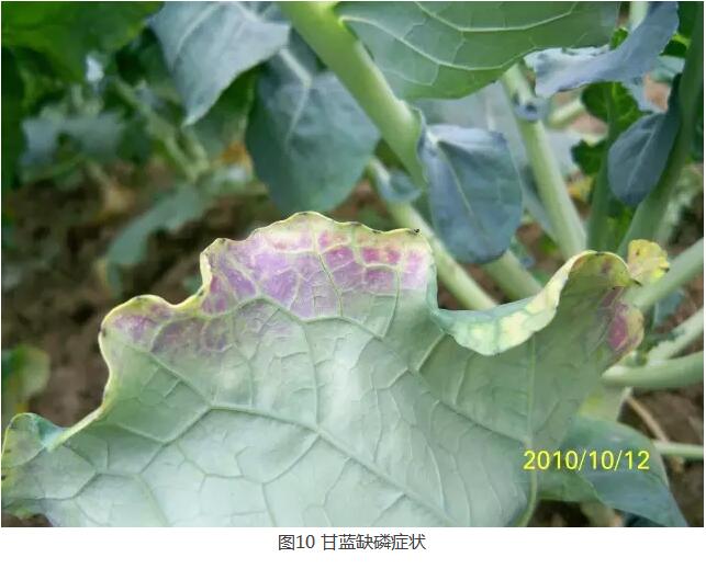 甘藍缺磷: 葉片呈現雜色,葉背面呈紫紅色,葉脈初更為明顯。生長發(fā)育受阻,產量下降。