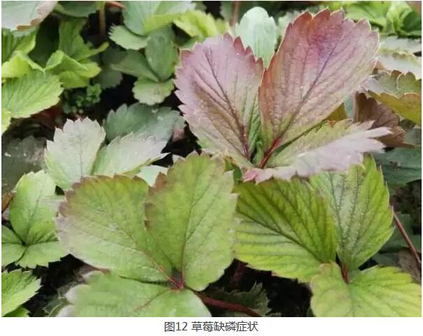 草莓缺磷:植株生長弱、發(fā)育緩慢、葉色帶青銅暗綠色。缺磷加重時,上部葉片外觀呈現紫紅的斑點,較老葉片也有這種特征。缺磷植株上的花和果比正常植株小。含鈣較多或酸度高的土壤以及疏松的沙土或有機質多的土壤易發(fā)生缺磷現象。