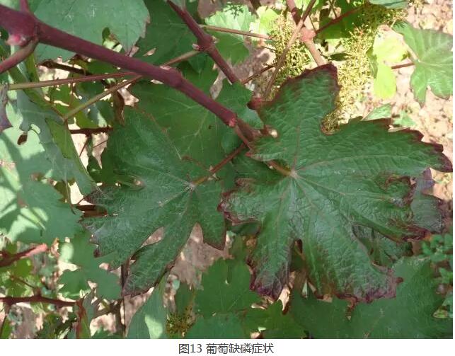 葡萄缺磷:生長緩慢,老葉邊緣變?yōu)榧t褐色,果串減少。
