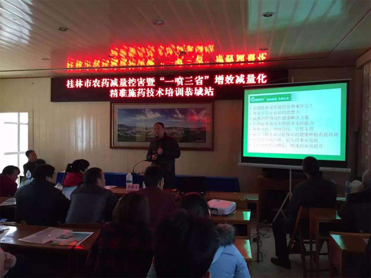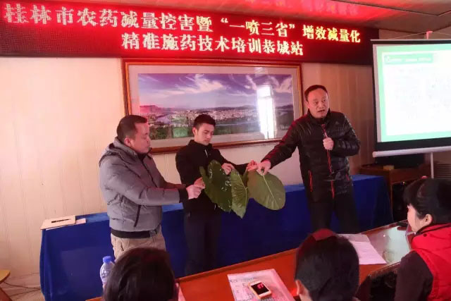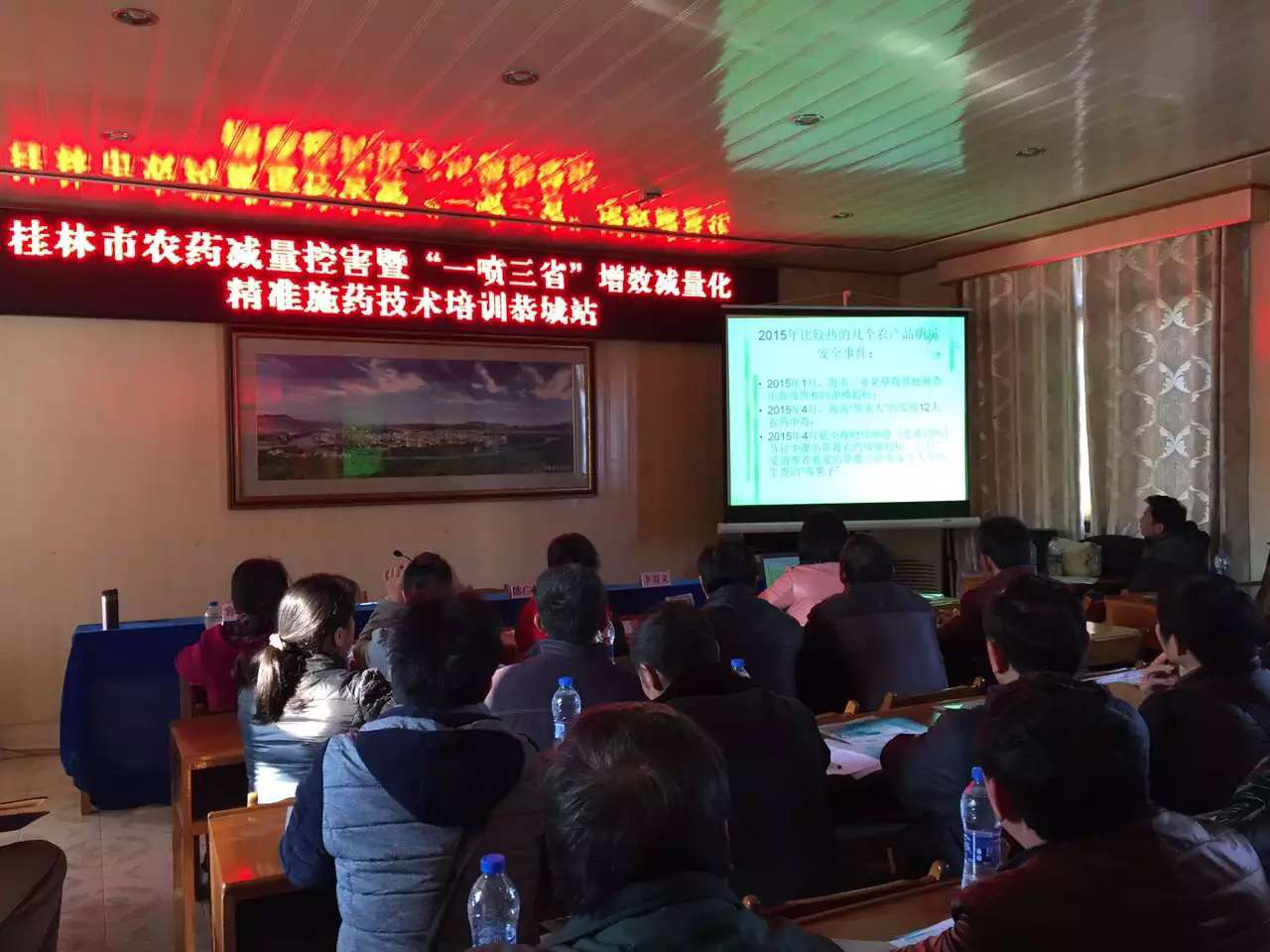 2016年1月18日,桂林市農(nóng)業(yè)局、桂林市農(nóng)業(yè)局植保站在恭城縣農(nóng)業(yè)局召開桂林市農(nóng)藥減量控害暨“一噴三省”增效減量化精準施藥技術(shù)培訓(xùn),此次培訓(xùn)是桂林市農(nóng)業(yè)局開展此類培訓(xùn)的第五站。