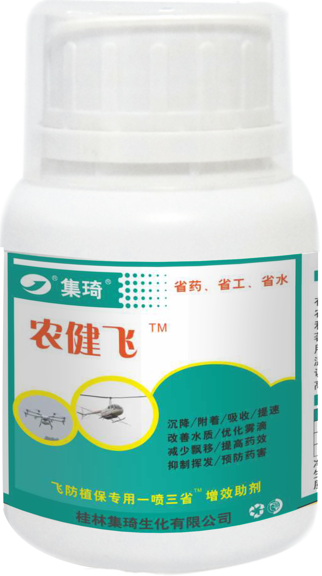 健飛是專業(yè)為飛機(jī)或大型噴霧機(jī)設(shè)計(jì)的助劑。可以減少農(nóng)藥使用量10-30%,能有效提高航空噴灑農(nóng)藥、