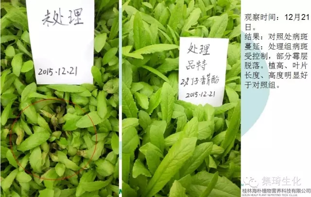 試驗(yàn)結(jié)果:對(duì)照處理病斑蔓延,品特處理組病斑很快得到控制。