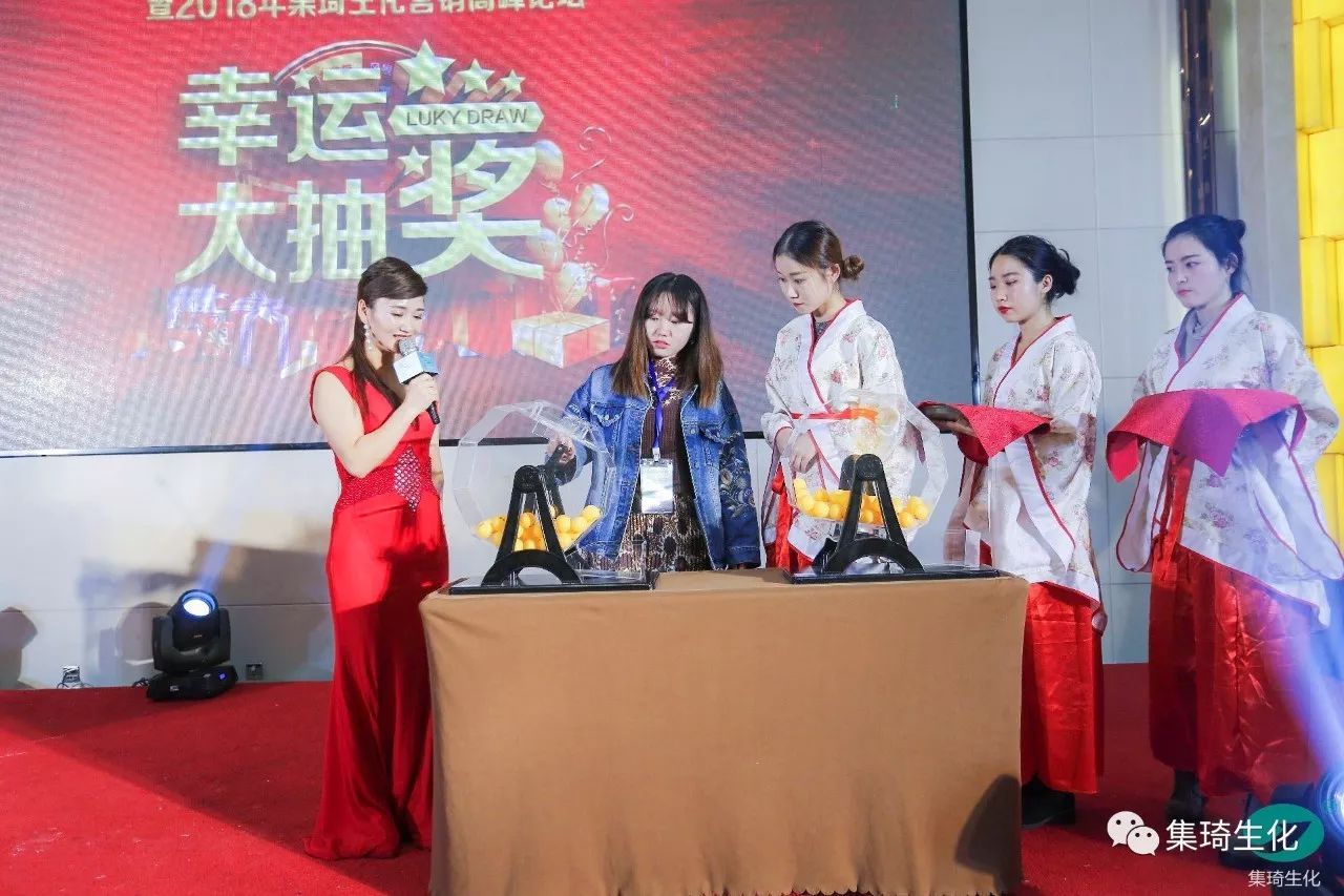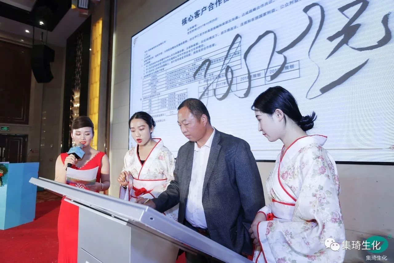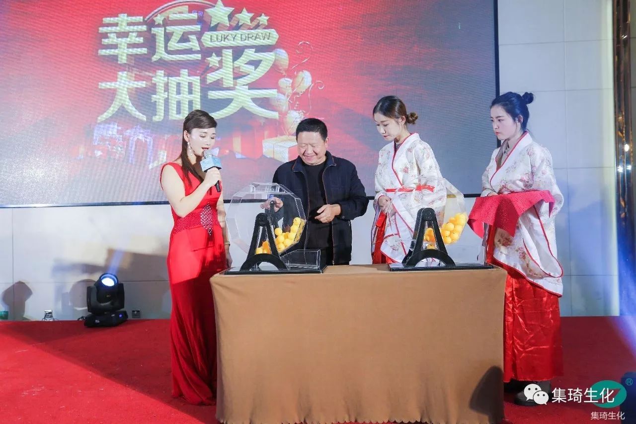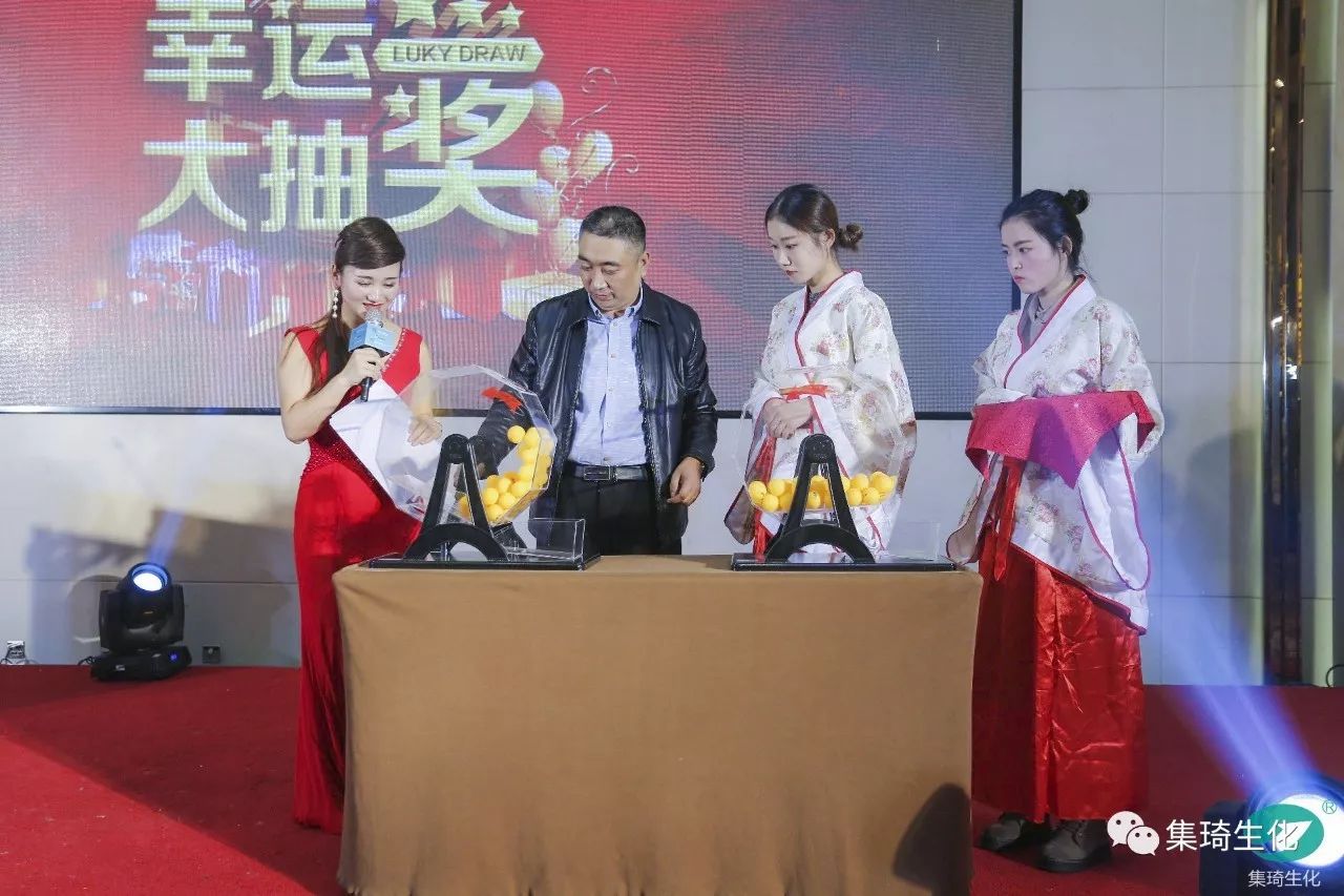 儀式首先由集琦銷售部長石志兵宣讀集琦生化戰(zhàn)略合作協(xié)議及抽獎?wù)?,隨后,會上50多位客戶依次上臺簽約,與桂林集琦達成2018年度戰(zhàn)略合作協(xié)議。本次簽約與抽獎環(huán)節(jié)新穎時尚,平板機簽約,與科技接軌,搖號機抽獎,確保公平、公正和公開。
