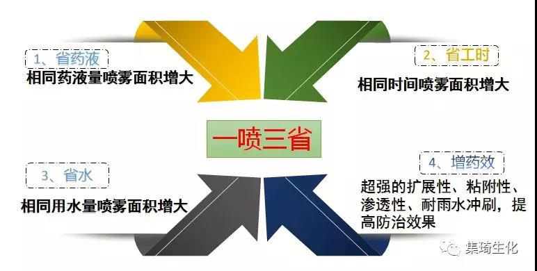 噴霧時(shí)添加“一噴三省”增效助劑(奇功),在保證防治效果的前提下可以節(jié)省化學(xué)農(nóng)藥的使用量,化學(xué)農(nóng)藥的使用量比常規(guī)使用量可以節(jié)省10—30%,每畝用水量節(jié)省30%,用工量伴隨用水量的減少而相應(yīng)節(jié)省。