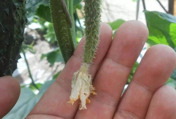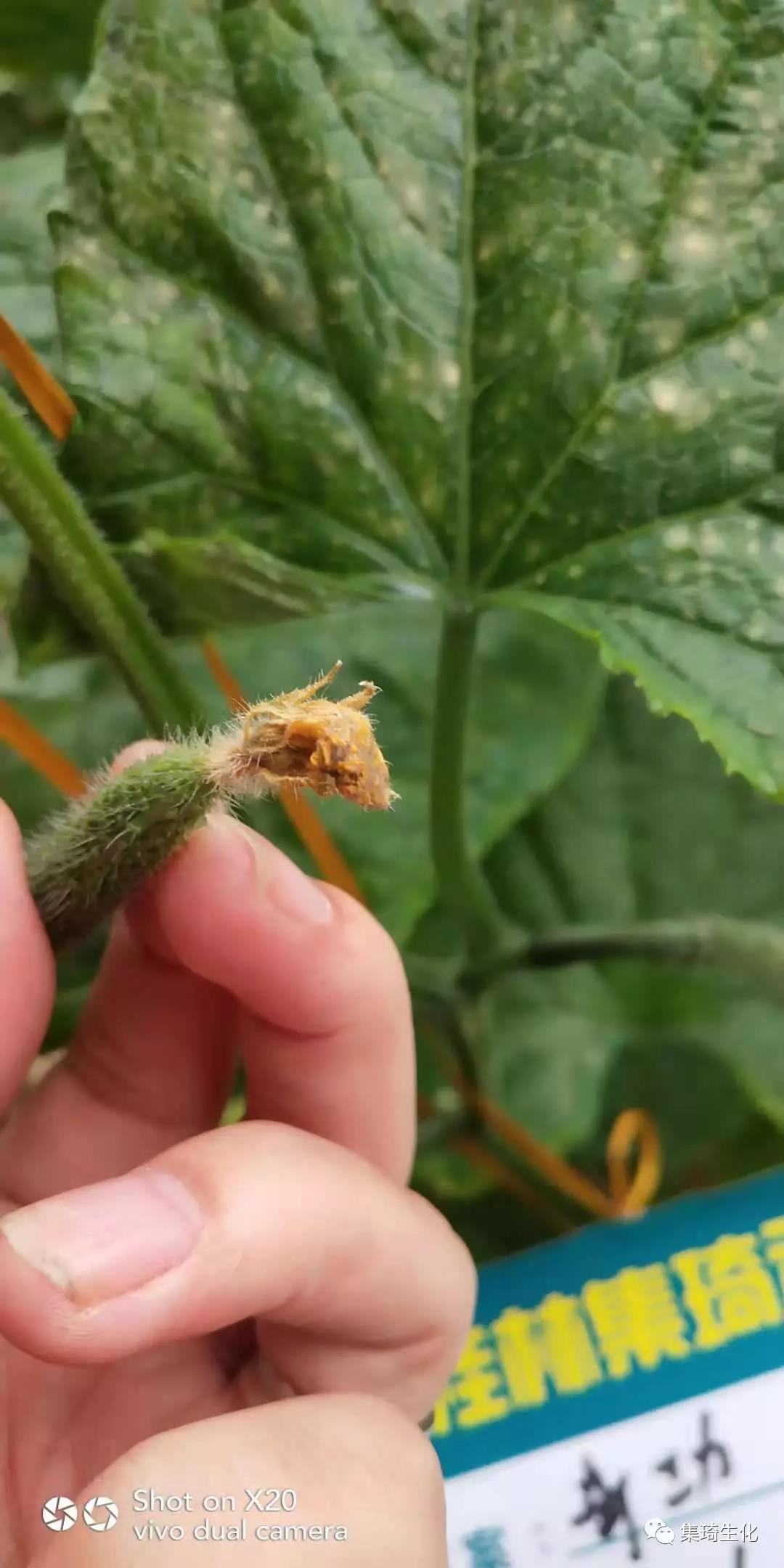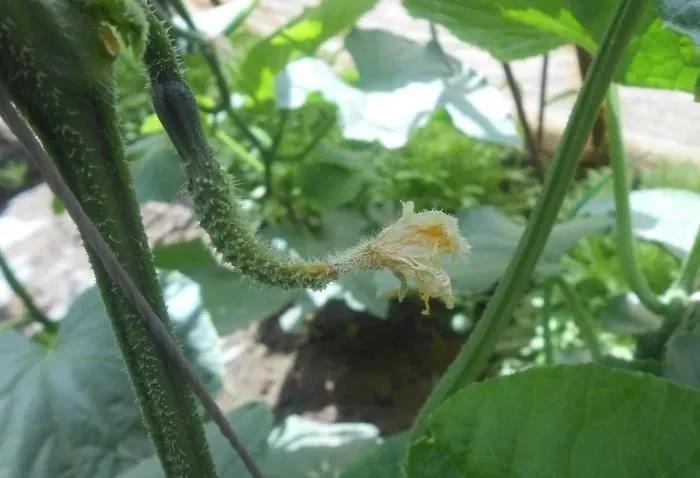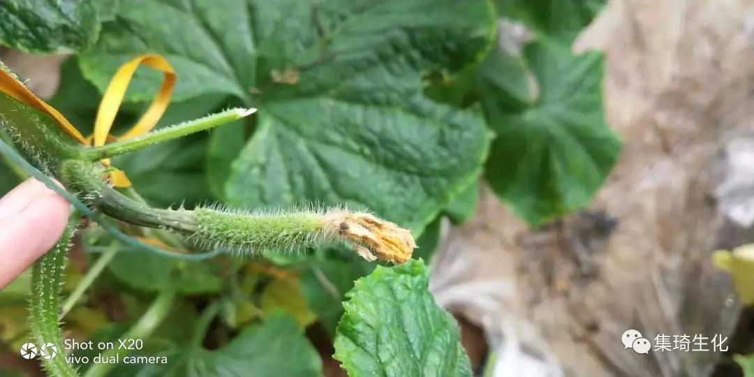 因連續(xù)陰天,幼瓜花萎蔫,初見(jiàn)灰毛。