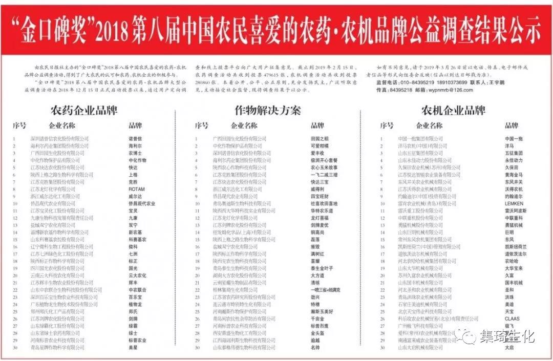 3月28日,由中央級媒體農(nóng)民日報社主辦的“金口碑獎”2018第八屆中國農(nóng)民喜愛的農(nóng)藥·農(nóng)機品牌頒獎盛典在北京隆重舉行