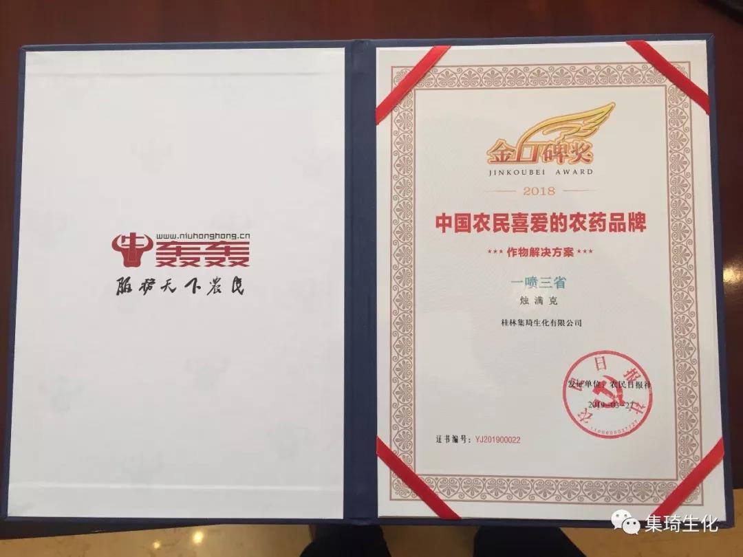 桂林集琦“一噴三省+燭滿克”榮獲“2018第八屆中國農(nóng)民喜愛作物解決方案”。