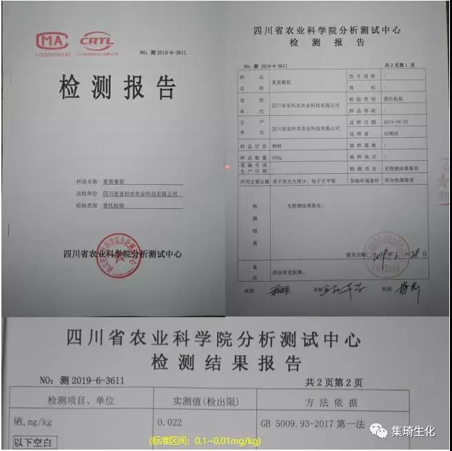 經(jīng)過(guò)半年時(shí)間桂林集琦綠色富硒方案在葡萄上的應(yīng)用,四川省亞科農(nóng)農(nóng)業(yè)科技有限公司的綿陽(yáng)三號(hào)葡萄基地成功產(chǎn)出富硒葡萄,經(jīng)四川省農(nóng)業(yè)科學(xué)院分析測(cè)試中心出具的報(bào)告顯示,該基地的葡萄含硒量達(dá)到0.022mg/KG,超過(guò)葡萄最低標(biāo)準(zhǔn)0.01mg/KG,達(dá)到富硒標(biāo)準(zhǔn)。