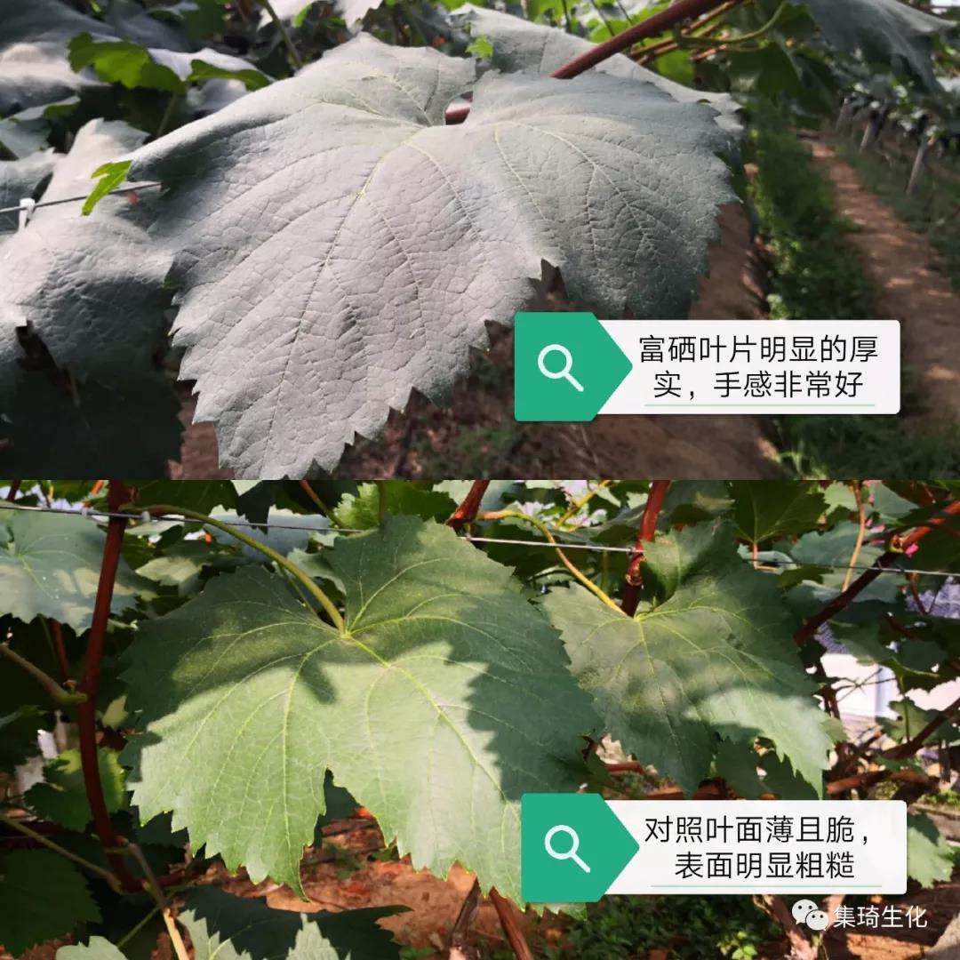 經(jīng)過(guò)桂林集琦綠色富硒方案處理的葡萄葉片明顯較對(duì)照區(qū)更厚更綠