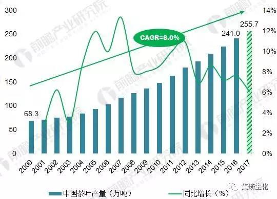 2000年從我國茶葉的產(chǎn)量變化情況來看,整體保持逐年增長的趨勢,2016年我國茶葉產(chǎn)量達(dá)到241.0萬噸,2017的產(chǎn)量在255.7萬噸左右,2000-2017年我國茶葉產(chǎn)量年均復(fù)合增長率達(dá)到8.0%。