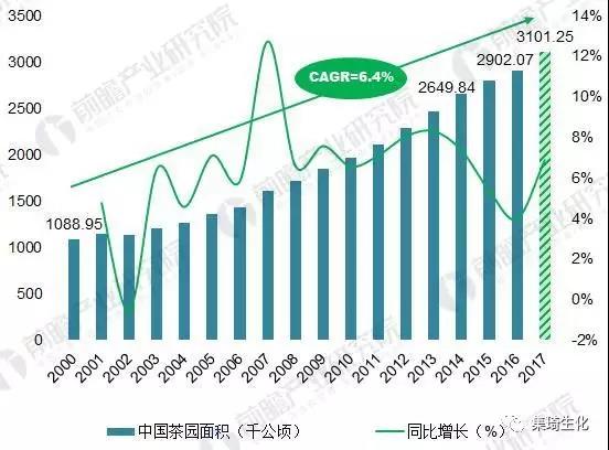 中國擁有3000多年的飲茶歷史,是世界上最大的茶葉種植國,也是茶園面積增速最快的國家,2016年茶園面積290.20萬公頃,比2000年增加181萬公頃,據(jù)測算2017年的茶園面積在310.13萬公頃左右,2000-2017年均復(fù)合增長率為6.4%。