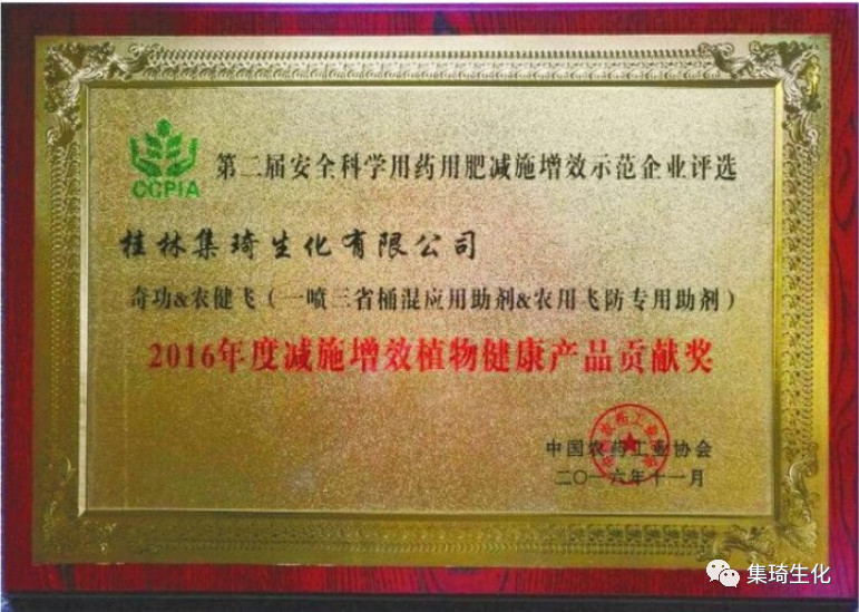 在第二屆安全科學(xué)用藥用肥減施增效示范企業(yè)評(píng)選中,桂林集琦生化有限公司憑借“一噴三省”榮獲“減施增效植物健康產(chǎn)品貢獻(xiàn)獎(jiǎng)”。
