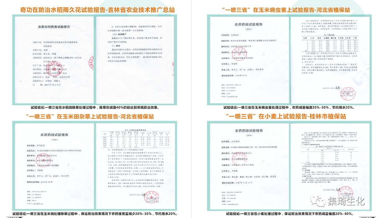 通過(guò)在鐘祥植保站,桂林植保站,宿州市植檢植保站,貴州省安順市鎮(zhèn)寧縣植保植檢站對(duì)不同作物進(jìn)行使用“一噴三省”助劑處理對(duì)照實(shí)驗(yàn)檢測(cè),得出以下結(jié)論: