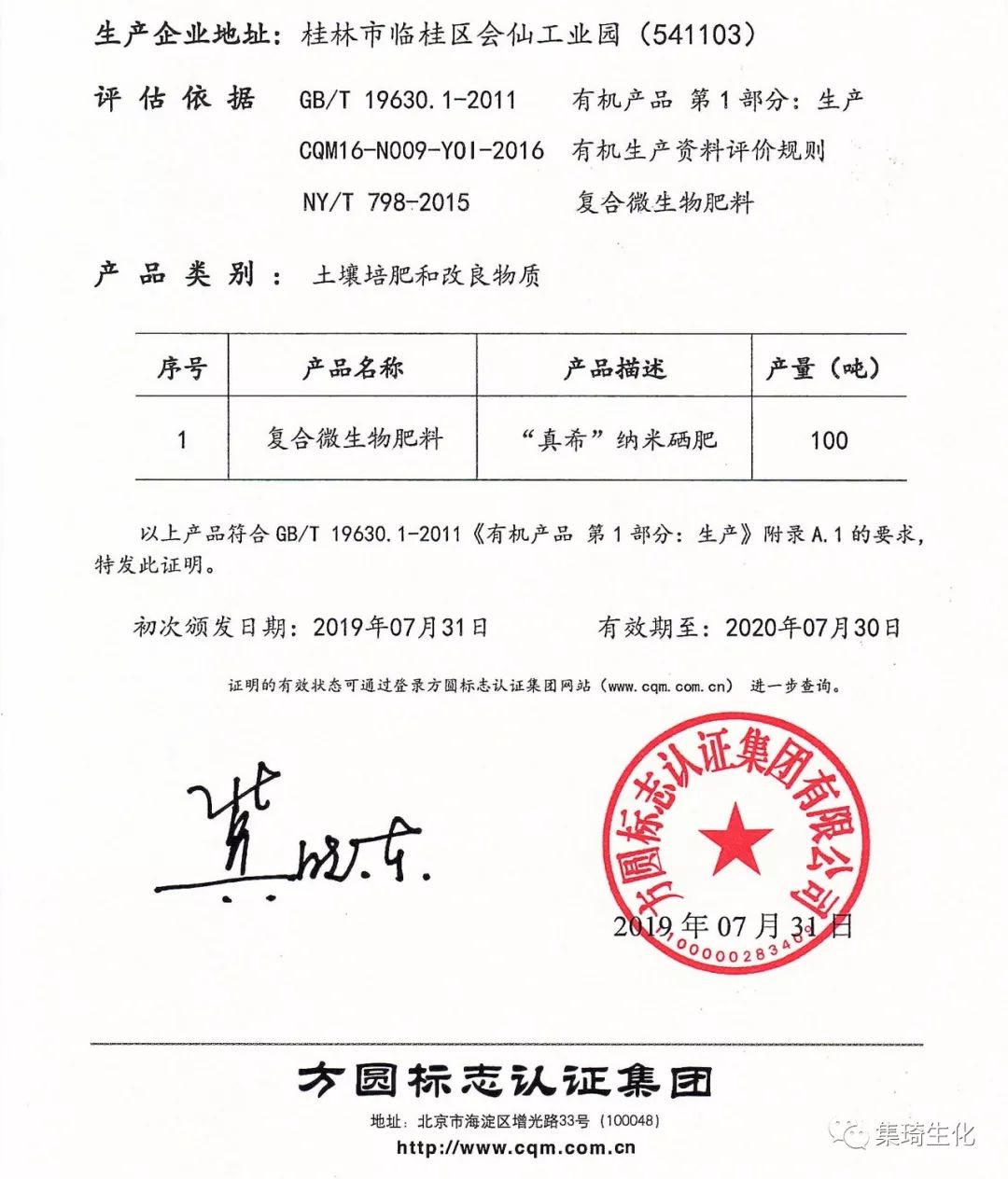 桂林集琦生化有限公司自向方圓標(biāo)志認(rèn)證集團(tuán)提出“有機(jī)生產(chǎn)資料評(píng)估證明”評(píng)估認(rèn)證起,從前期的自我申報(bào)、提交材料及合規(guī)性的審查與認(rèn)定,桂林集琦生化有限公司一直嚴(yán)格要求,以高于標(biāo)準(zhǔn)的自我要求為方向。在相關(guān)專(zhuān)家的層層審批及現(xiàn)場(chǎng)審查評(píng)定后,“真?!?/span>復(fù)合微生物納米硒肥終于成功獲得“有機(jī)生產(chǎn)資料評(píng)估證明”認(rèn)證。
