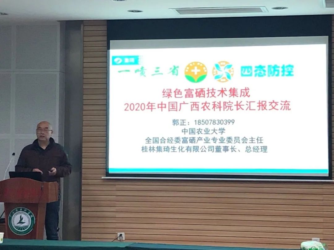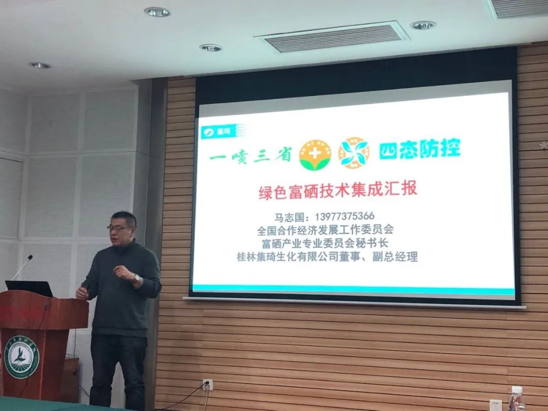 在會(huì)議上全國(guó)合經(jīng)委富硒產(chǎn)業(yè)專業(yè)委員會(huì)主任郭正和全國(guó)合經(jīng)委富硒產(chǎn)業(yè)專業(yè)委員會(huì)秘書長(zhǎng)馬志國(guó)給各位專家做了桂林集琦2020年一噴三省+四態(tài)防控+綠色富硒技術(shù)集成的匯報(bào)交流。表達(dá)了桂林集琦對(duì)于未來在不同領(lǐng)域合作愿景,將綠色富硒技術(shù)集成由成果轉(zhuǎn)化處直接對(duì)接基地,使作物品質(zhì)提升,營(yíng)養(yǎng)價(jià)值增高,作物病蟲害減少。該提議得到了白院長(zhǎng)及其他領(lǐng)導(dǎo)的一致認(rèn)可,并在當(dāng)天簽訂了戰(zhàn)略合作協(xié)議。