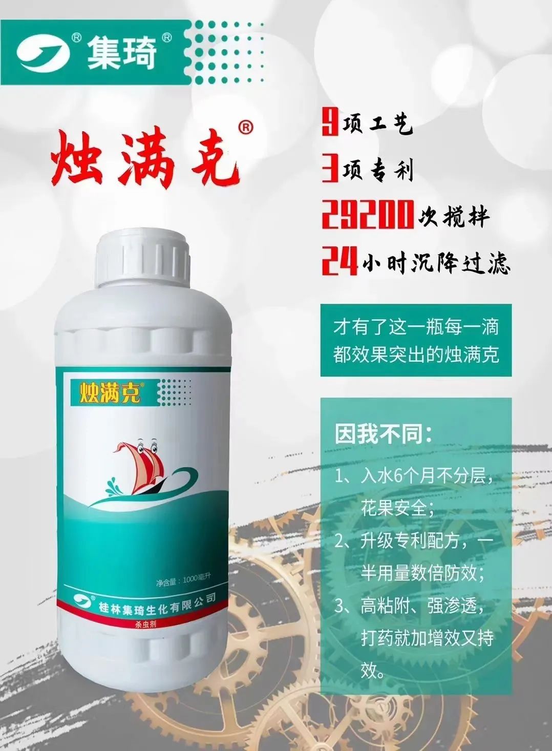 奇功是桂林集琦生化“一噴三省+”綠色健康植保防控技術(shù)體系代表產(chǎn)品。2004年公司與中國農(nóng)業(yè)大學專家教授合作,對農(nóng)藥肥料利用率的關(guān)鍵技術(shù)進行研發(fā),形成“一噴三省”技術(shù)體系,使農(nóng)藥利用率進一步提升。